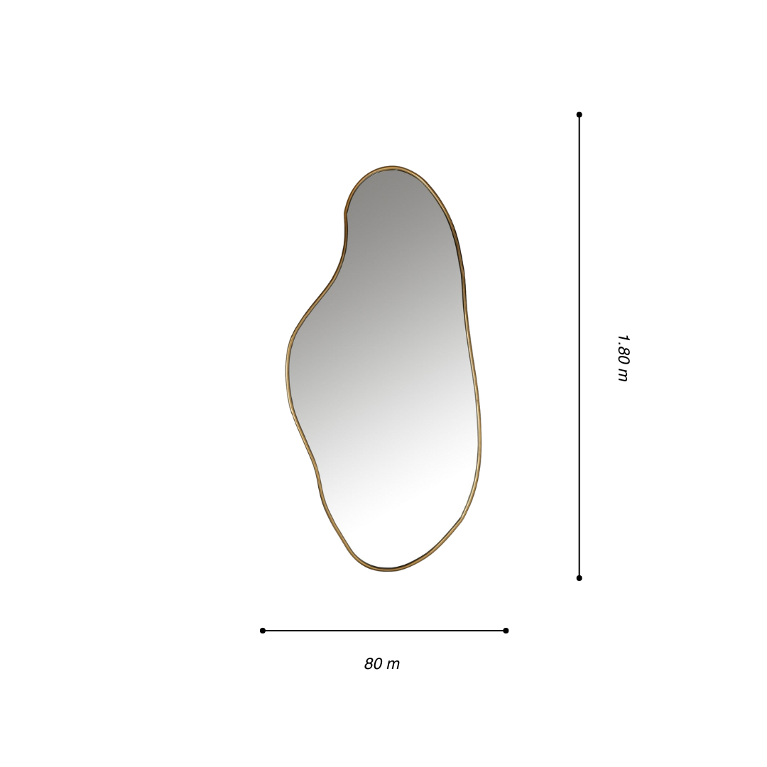 El espejo Irregular Mila toma su forma de la fluidez natural del cuerpo humano y el movimiento del trazo libre. Su contorno orgánico, enmarcado con solera metálica de 1 pulgada en acabado dorado, aporta carácter sin rigidez, sutileza sin anonimato.